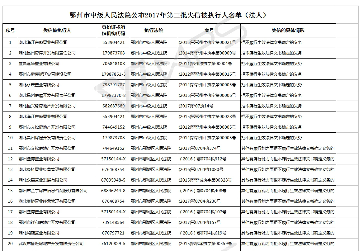 为推进社会诚信体系建设,创造良好的信用环境,鄂州市中级人民法院启动“破冰行动”, 曝光第三批“老赖”黑名单,并对“老赖”进行信用惩戒。本次公布的失信被执行人均因有正常履行能力拒不履行,本院对其不诚信行为予以曝光。