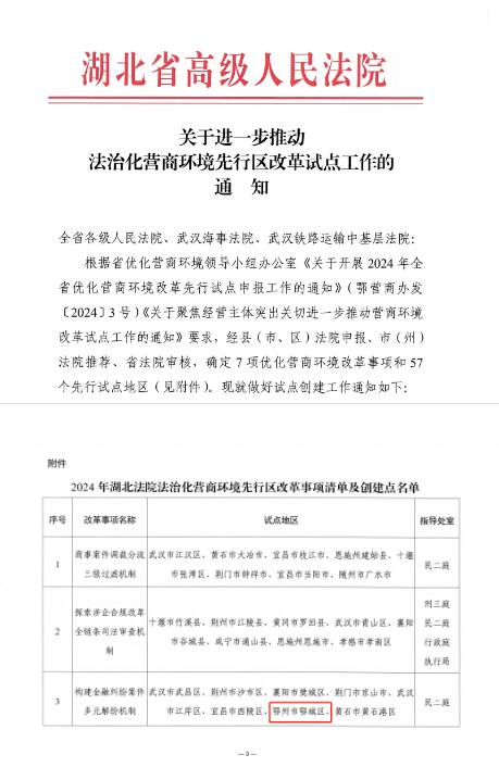 近日,湖北省高级人民法院公布2024年湖北法院法治化营商环境先行区创建名单,共确定7项改革事项和57个先行试点区。鄂城区法院“构建金融纠纷案件多元解纷机制”入选。